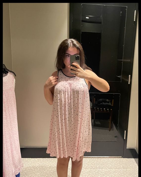 This is the most comfortable nightdress I tried on, and I wish it came in a size smaller so it would fit me correctly. The Tencel Modal and spandex fabric is so soft and slinky on the skin that I wanted to take a nap in the dressing room right on that messy chair in the background. Thanks to the cap sleeves, high sweetheart neckline, and extremely relaxed fit, it has a traditional look, which I can imagine working well on some people, but on me looks somehow both too mature and too childlike. It also runs large, so I recommend going one or two sizes down. I’d get this if the priority was texture only.