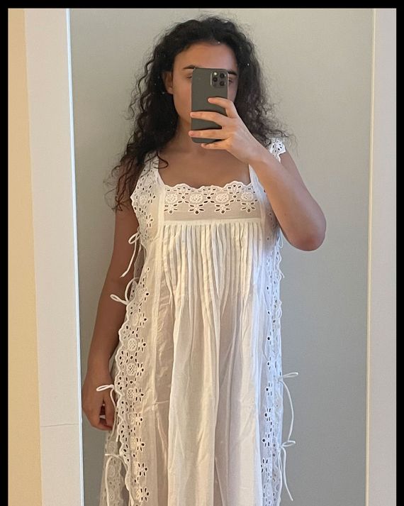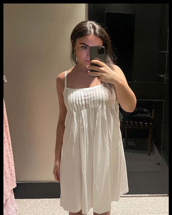 I’m a Reformation lover, not only for its impeccable dressing-room lighting and bizarre in-person shopping experience (highly recommend the “magic closet” locations), but because a lot of its clothes rock. The brand’s first-ever pajama dress is no exception — it has adorable detailing, a fit that flatters my chest (with and without a bra underneath), and it comes with a matching scrunchie “while supplies last.” It’s so cute and would not be too sheer to wear with guests over. However, it feels like a cop-out to lean on a brand so synonymous with millennials and Gen Z to achieve the classic look I’m going for.